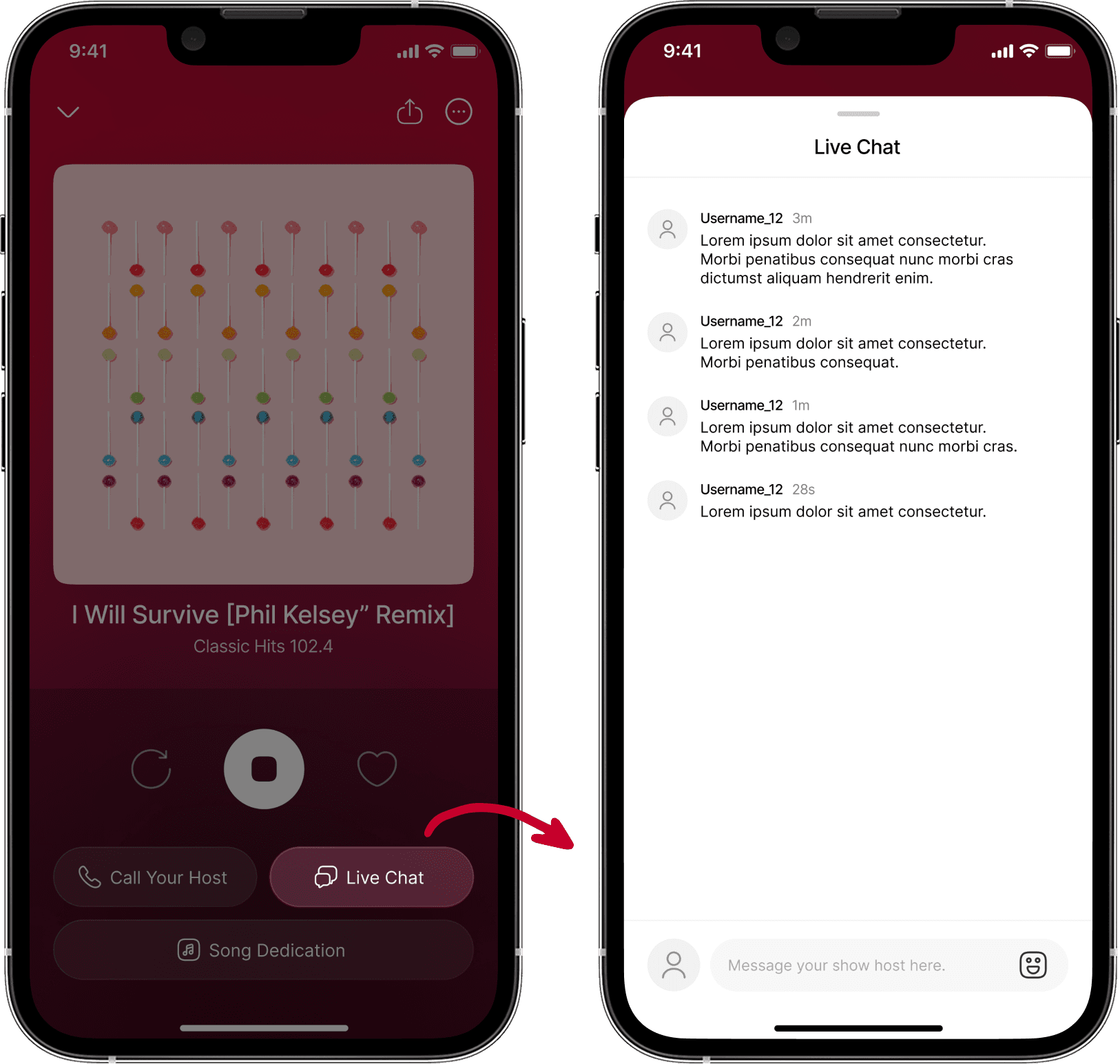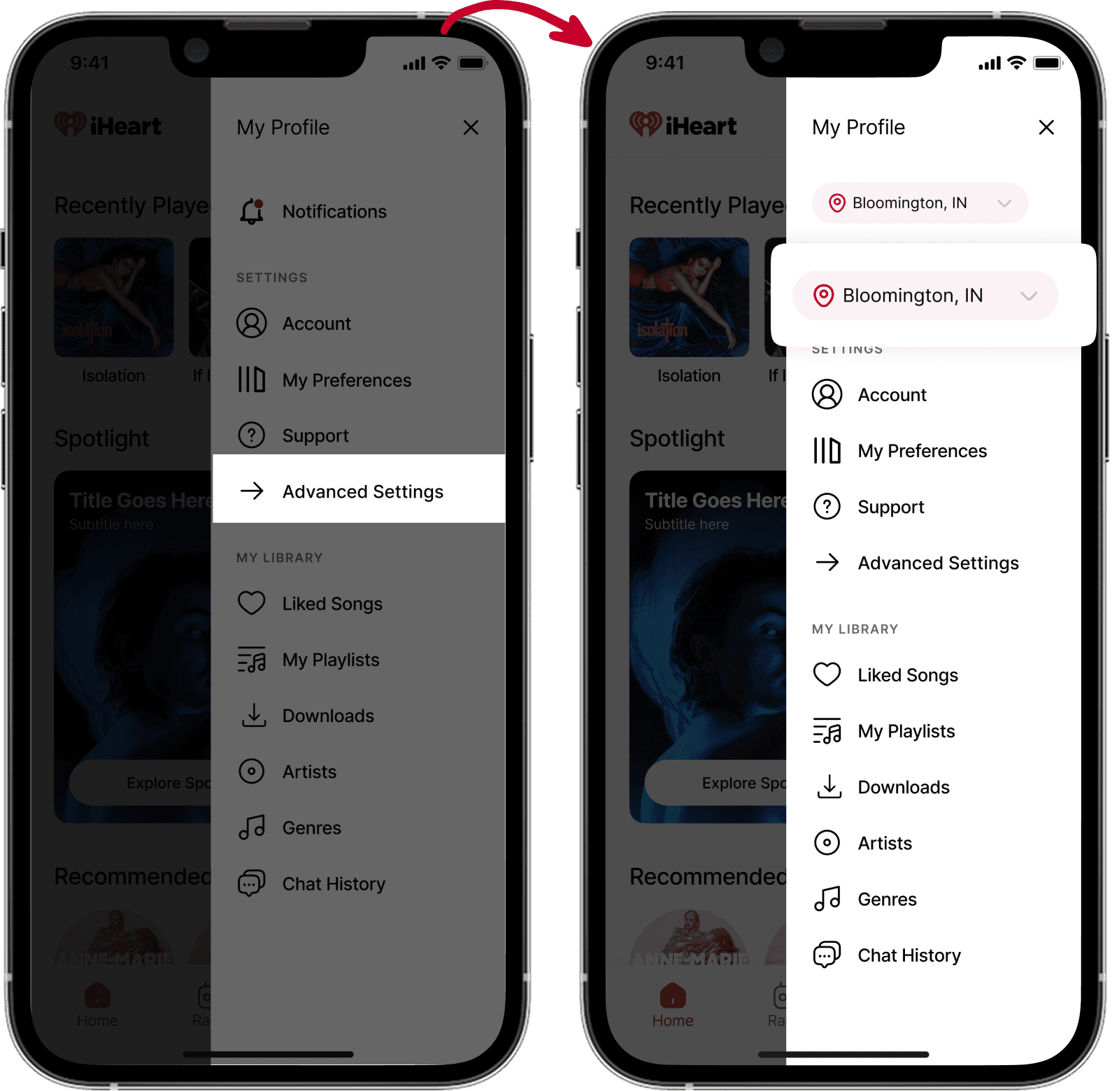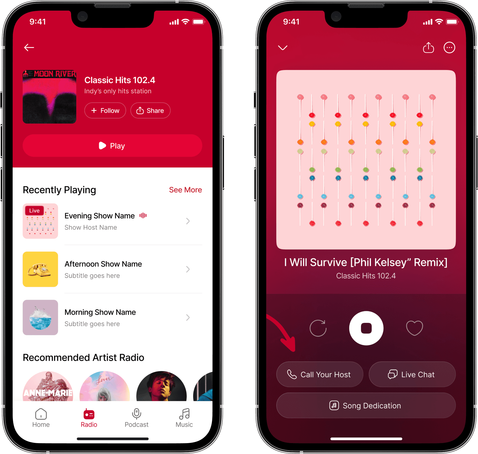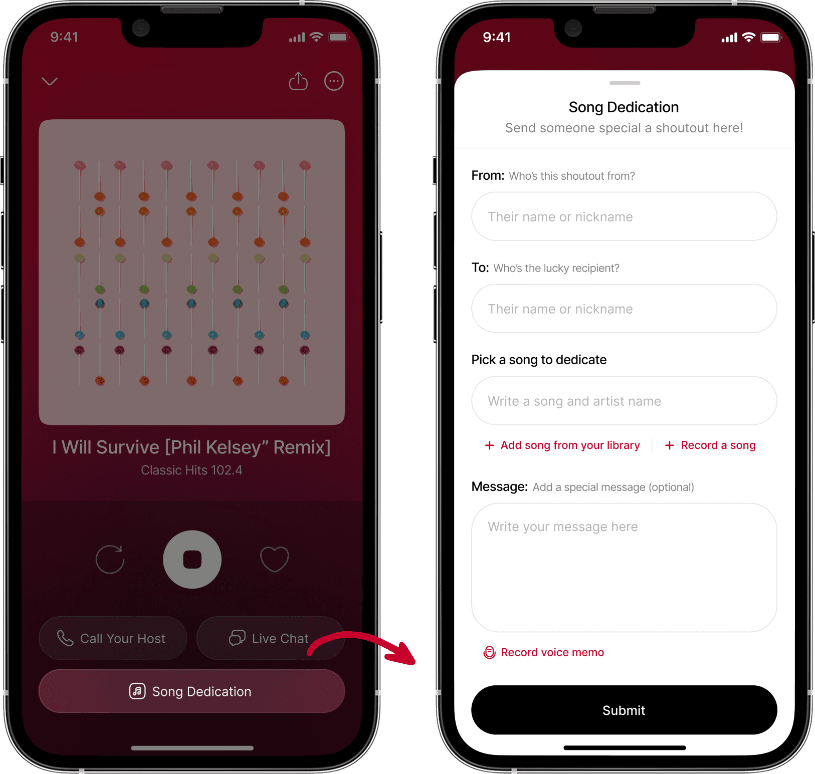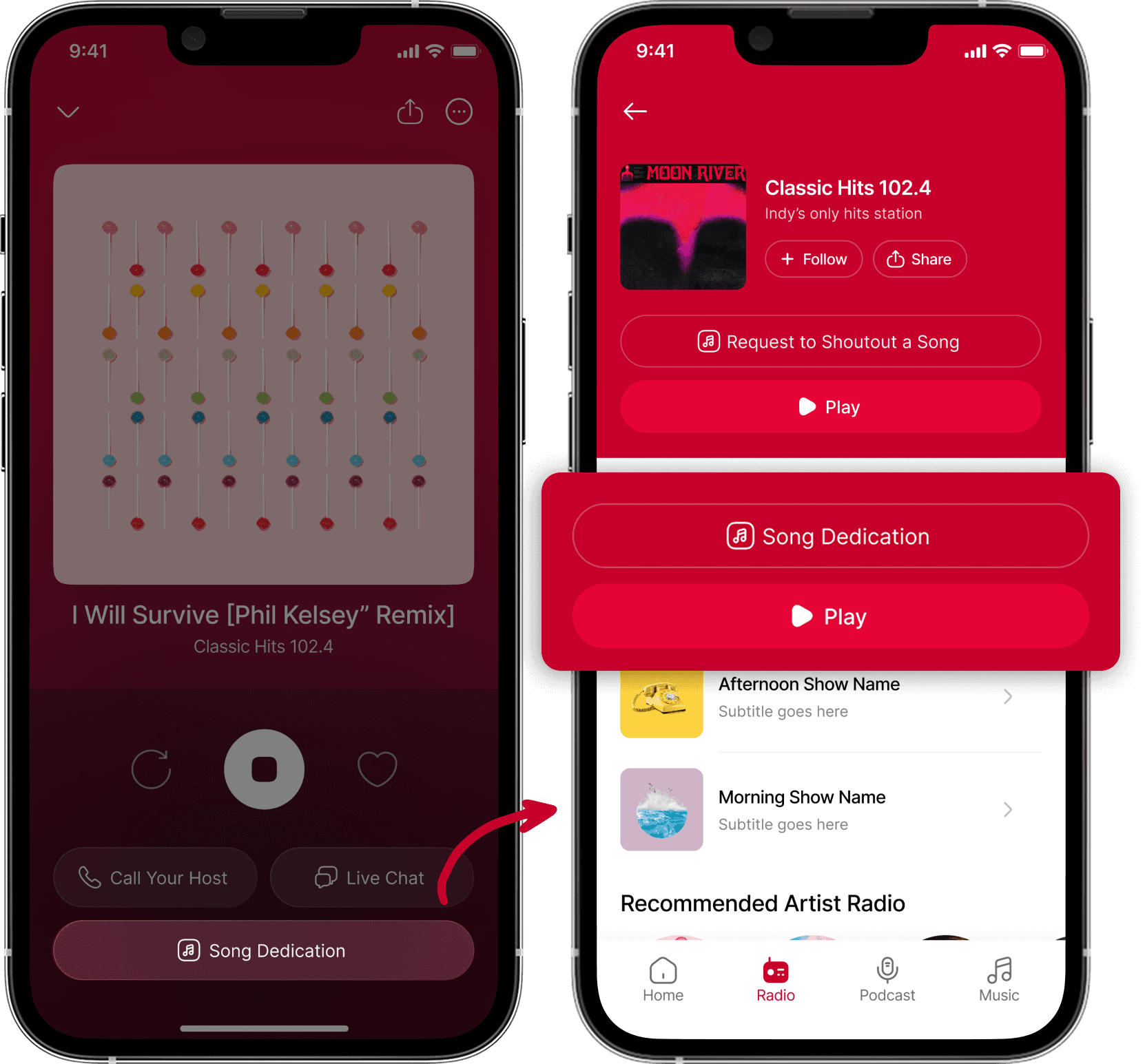 For the Live Radio, users assumed dedications were limited to the 'currently playing' song. Moving the feature to the main radio station page improved clarity and usability.