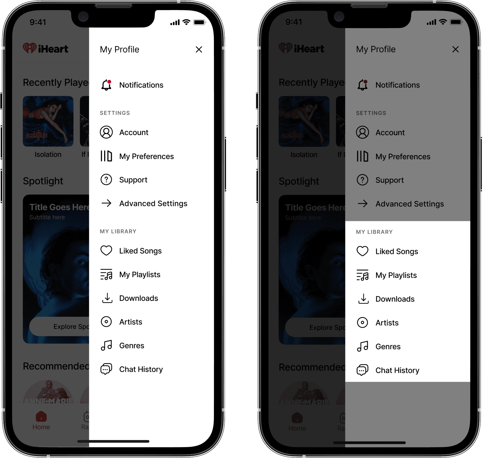 Redesigned iHeart Radio app with interactive prototype based on the explored opportunities.